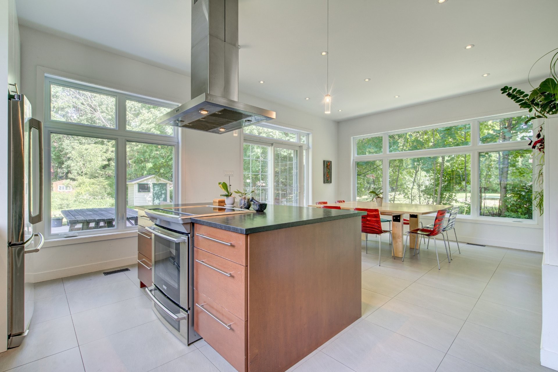 Entièrement rénovée et agrandie en 2012, la maison marie harmonieusement le cachet intemporel de Baie-D'Urfé avec des espaces intérieurs contemporains, aérés et baignés de lumière. Ici, les volumes surprennent : des plafonds aux hauteurs variées, des demi-niveaux subtils entre les pièces, créant une dynamique architecturale aussi belle que fonctionnelle. Le salon principal, chaleureux et ouvert, mène à une salle à manger en contrebas, baignée de lumière naturelle. Plus loin, une cuisine moderne et conviviale, pensée pour recevoir, communique avec une terrasse invitante.