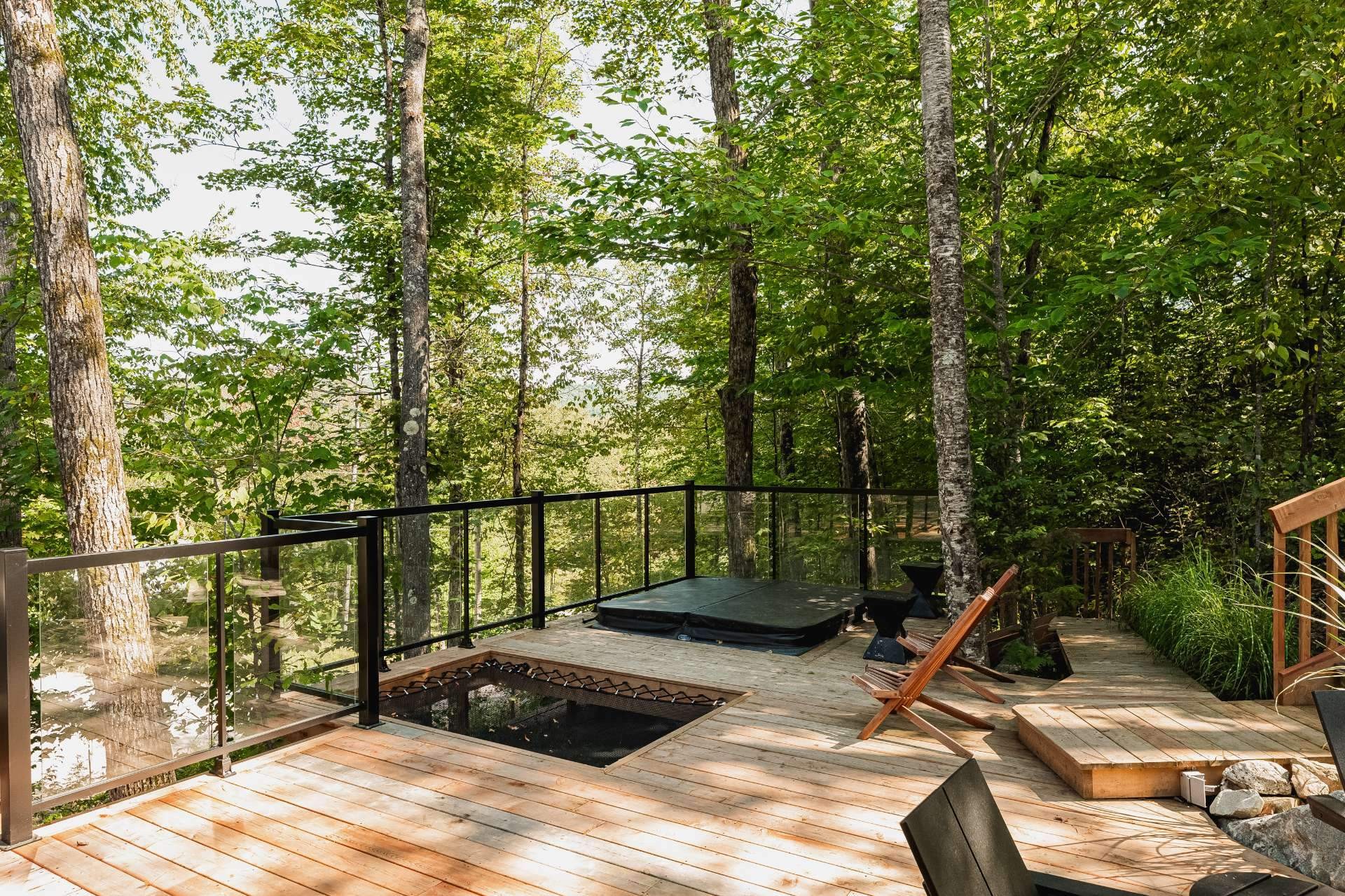 Jacuzzi, 1 thermopompe murale, terrasse en bois, finition de type toit plat.
