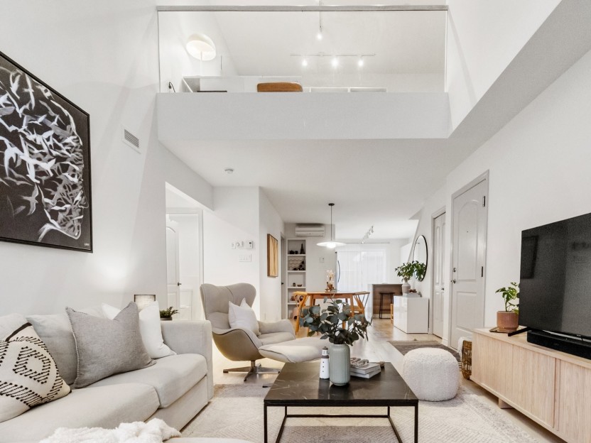 Condo lumineux de 2 chambres avec mezzanine, situé à l'étage supérieur d'un comp...